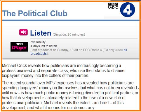I’ve just picked up on BBC IPlayer this great Radio 4 investigation by Michael Crick on the funding of political parties and the rise of what he calls “The Political Club”.
